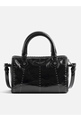 Patent leather bag with vintage effect and studs, adjustable shoulder strap and handles with metal wing signature.