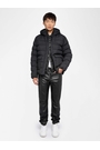 Short puffer jacket with zip closure and hood, functional pockets and elasticated cuffs, wing embroidery at front and print at back.