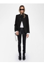 Structured straight blazer, high collar, rhinestone back details, removable flap, and button fastening.