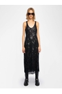 Long lingerie-inspired sleeveless dress in lace embroidered with sequins and pearls.