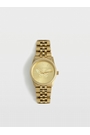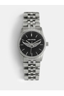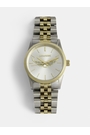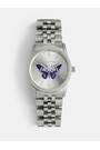 Stainless steel watch with silver dial with gold wings and steel bracelet.