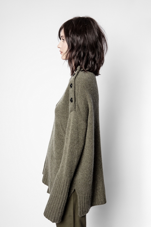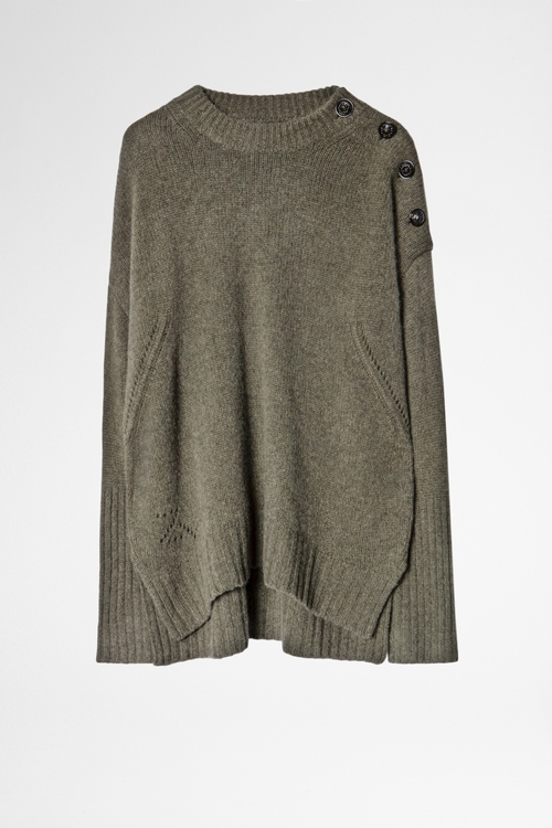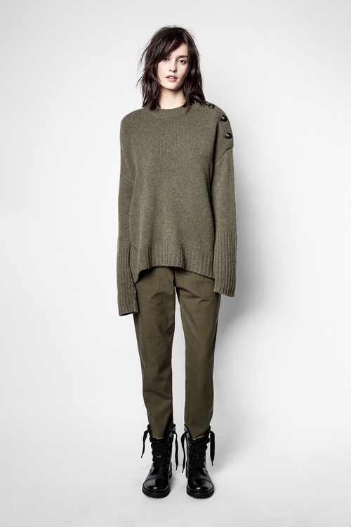 Zadig&Voltaire womenÂ’s khaki cashmere sweater with buttons on shoulder. 100% cashmere. Dimensions: Model is 176 cm/5'9" and is wearing a size S.