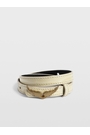 - Holes, keeper, and buckle with silver signature metal wings