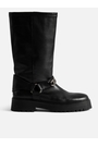 Biker-inspired leather ankle boots with harness adorned with chain details.
