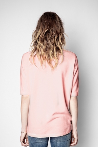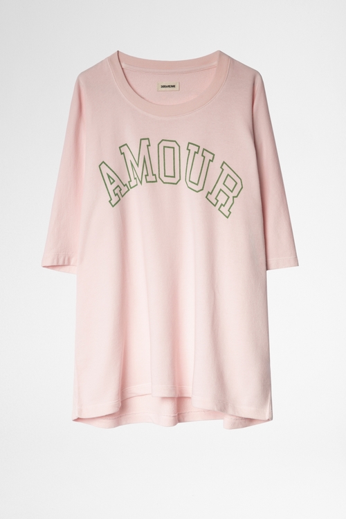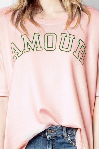 Zadig&Voltaire women’s pink short-sleeved sweatshirt, “AMOUR” print on front. 70% cotton 30% modal. Dimensions: Model is 180 cm/5'11" and is wearing a size S.